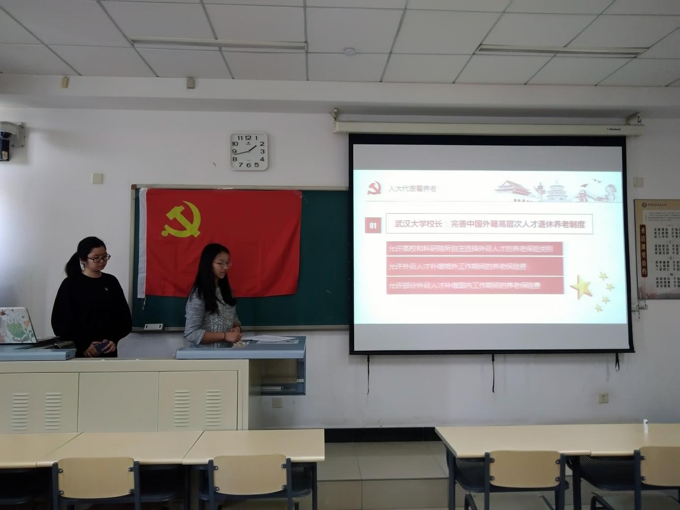 第一个环节是“两会”热点学习。来自全国各地的“两会”代表针对国家发展的各个方面的问题提出自己的看法,国家总理李克强也在大会上对过去五年政府的工作进行总结,反腐败斗争、社会保障、教育改革、医疗改革、脱贫攻坚、住房制度、改革开放、环境保护、乡村振兴、依法治国等话题成为今年“两会”的热点话题。党员们两人一组,选择两会的热点话题进行深入学习,并将自己的学习心得与大家分享,在理论学习中,一起探讨了社会保障、环境保护等热点话题,并且提出了自己的观点和看法。通过学习分享活动,大家进一步加深了对党的理论知识的认识和理解,并结合自己所学专业,加深对党的政策方针的理解。