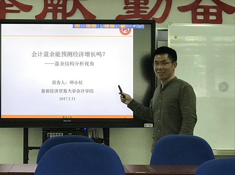 2017年5月31日中午12:30,“会乐佳坊”在行知楼102举办第6期博士论坛,青年教师卿小权做了“会计盈余能预测经济增长吗?——盈余结构分析视角”的主题报告。