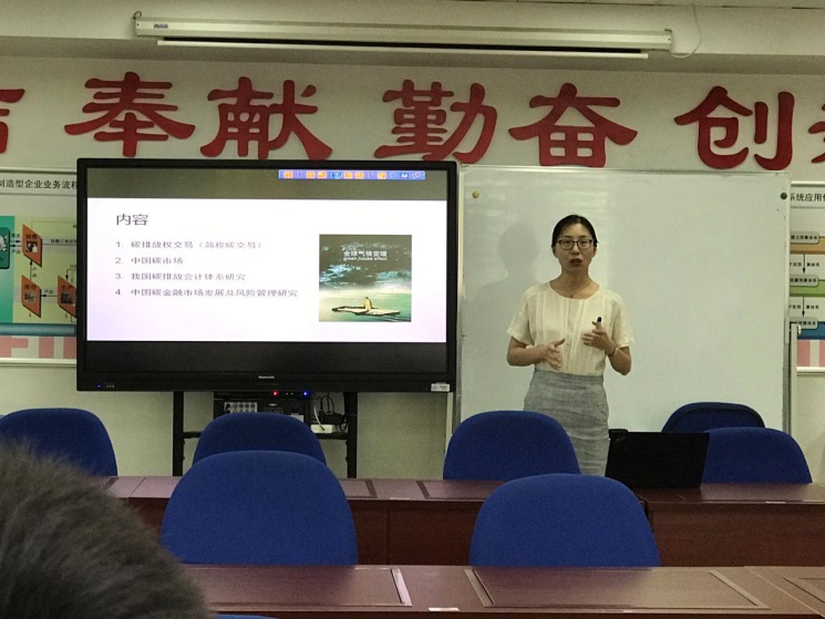 2017年5月7日中午12:30,“会乐佳坊”在行知楼102举办第8期博士论坛,青年教师孙静做了“中国碳市场及碳金融风险研究” 的主题报告。