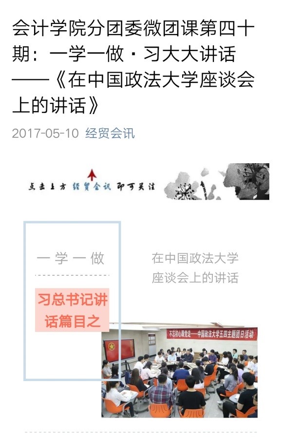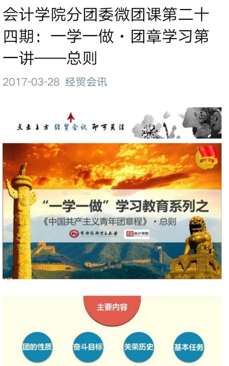 学院分团委采用微团课的形式组织团员深入学习团章、团史以及习近平总书记系列重要讲话精神。自3月19日“一学一做”实践教育活动微团课上线以来,截止5月共开设微团课18期。团课内容涉及“一学一做”教育实践活动动员通知1期;《中国共产主义青年团团章》学习10期,以《团章》总则、各章节为主线向团员介绍团的性质、团员履行的义务、享有的权利、团的组织制度、团的地方组织、团的基层组织、团的干部、团旗团徽团歌团员证、团的经费等内容。此外,微团课还节选习近平总书记与青年学生有关的重要讲话7期,包括:习近平总书记给北京大学考古文博学院2009级本科团支部全体同学的回信、给华中农业大学“本禹志愿服务队”的回信、给河北保定学院西部支教毕业生群体代表的回信、在北京大学师生座谈会上的讲话、同北京师范大学师生代表座谈时的讲话、与中国科技大学师生代表交流座谈会时的讲话以及在中国政法大学座谈会上的讲话等内容。学院分团委以微团课的形式和载体对广大团员开展集中学习培训,不断加强对广大团员的思想引领工作,团员们反映学习效果不错。
