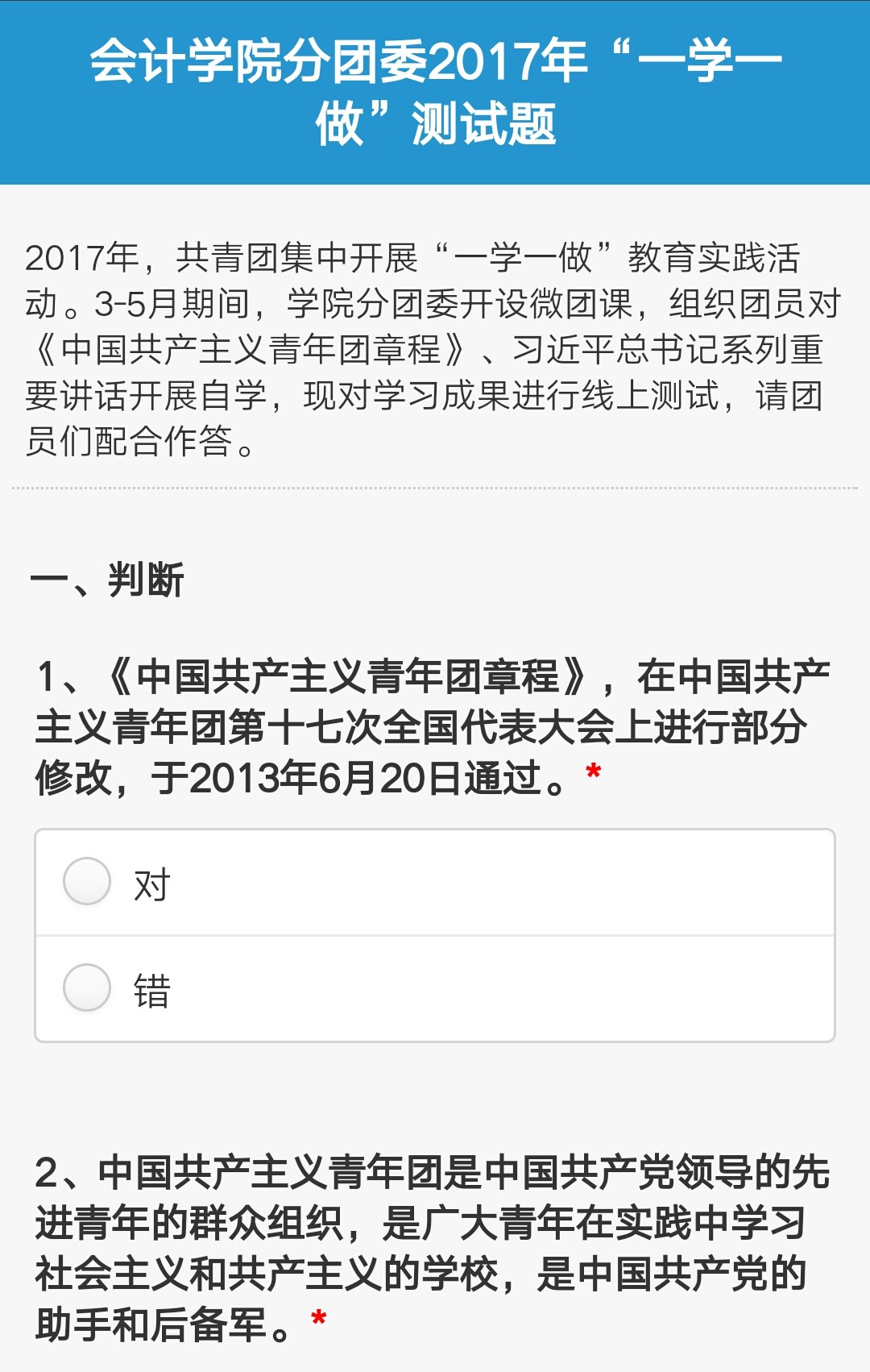 微团课推送后,学院分团委以“问卷星”的形式开展“一学一做”自学阶段测试,学院非毕业班团员840人全员参与测试,平均成绩91分,学以致用,巩固了前期开展自学的学习成果。