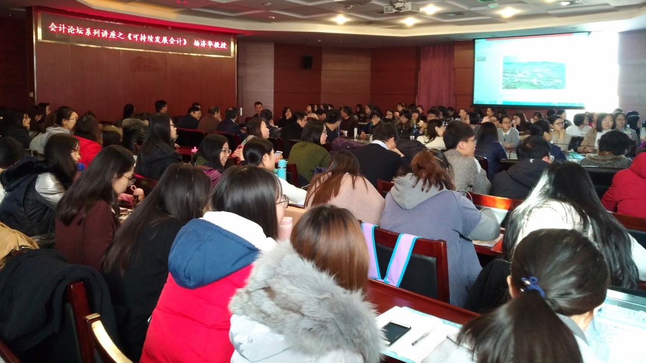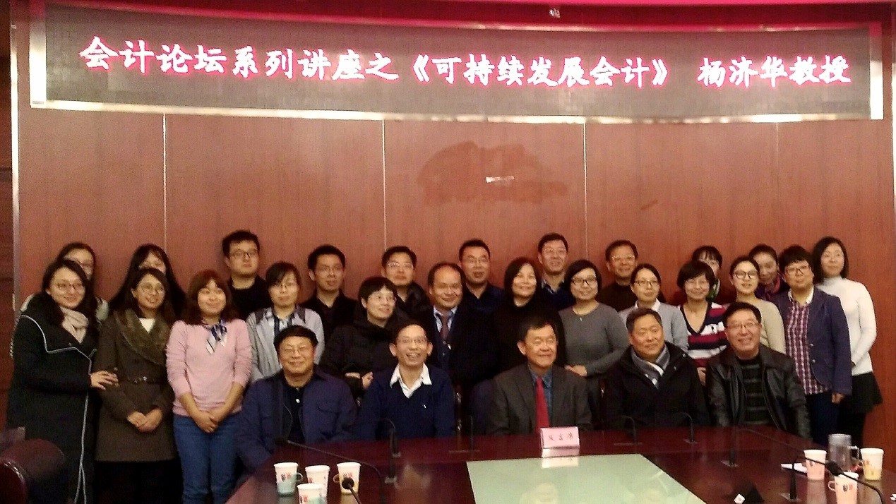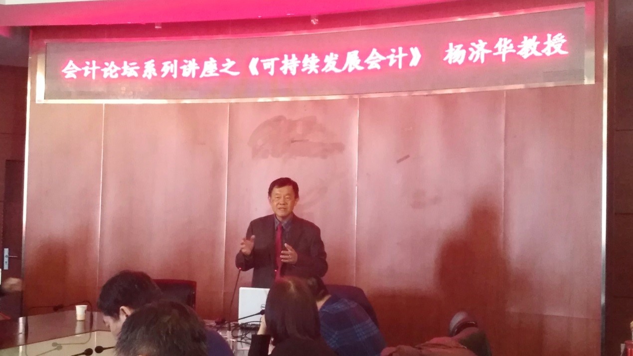 2017年11月20日上下午14:00,由bet365中国客服电话和科研处主办的“可持续发展会计”讲座在博纳楼第七会议室举办。本次讲座非常荣幸地邀请到美国夏威夷大学雪德(Shidler)商学院的会计学教授杨济华(David C. Yang)作为主讲人。参加本次讲座的有前财政部企业司司长刘玉廷,中国会计学会常务副秘书长周守华教授,bet365中国客服电话院长崔也光教授,bet365中国客服电话杨世忠教授、付磊教授、顾奋玲教授、李百兴教授、马元驹教授、栾富贵教授、王凡林教授、蔡立新副教授。此外参加本次讲座的还有bet365中国客服电话的一些青年教师、在校博士生、硕士研究生。本次讲座由李百兴老师主持。
