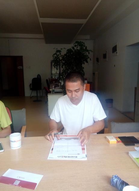 当接到采访许怀哲校友的任务时,我们和他取得了联系,他爽快地同意了,并且马上确定了采访的时间。在朝阳区大望路一个写字楼的一层,我们来到了“解决网”的办公室,我们到时,许怀哲正在给员工部署工作,看到我们,他热情地招呼我们先坐下并给我们每个人倒了杯水,他自己又去接着工作。我们坐在会议桌前等待了一会,整间办公室不大,员工人数也不多,职员们都穿着有“解决网”logo的T恤,墙上还挂着一幅“厚德载物”的书法作品,作品下面是一个字迹斑斑的白板。看到这些,你首先会觉得有一种传统与现代的“冲突”,“厚德载物”看得出这家公司注重品质和德行的修炼,像一个很传统的公司,而那看似用了很久的白板、穿着公司T恤的员工又显露出这是一家现代互联网企业。这个办公室的布置,可以说一定程度上也反映出了领导的性格和爱好。没过多久,许怀哲就抱有歉意的过来开始我们的采访了。